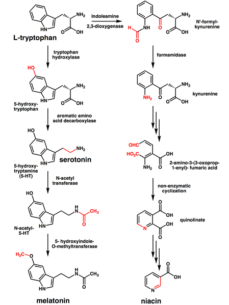 The precursor to melatonin is serotonin, a neurotransmitter that itself is derived from the amino acid tryptophan. Within the pineal gland, serotonin is acetylated and then methylated to yield melatonin.